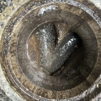 敷地内に樹木などを植えていると、排水桝と排水管の繋ぎ目から根が侵入し、流れを塞ぐようになります。木の根の撤去と管内洗浄を行います。