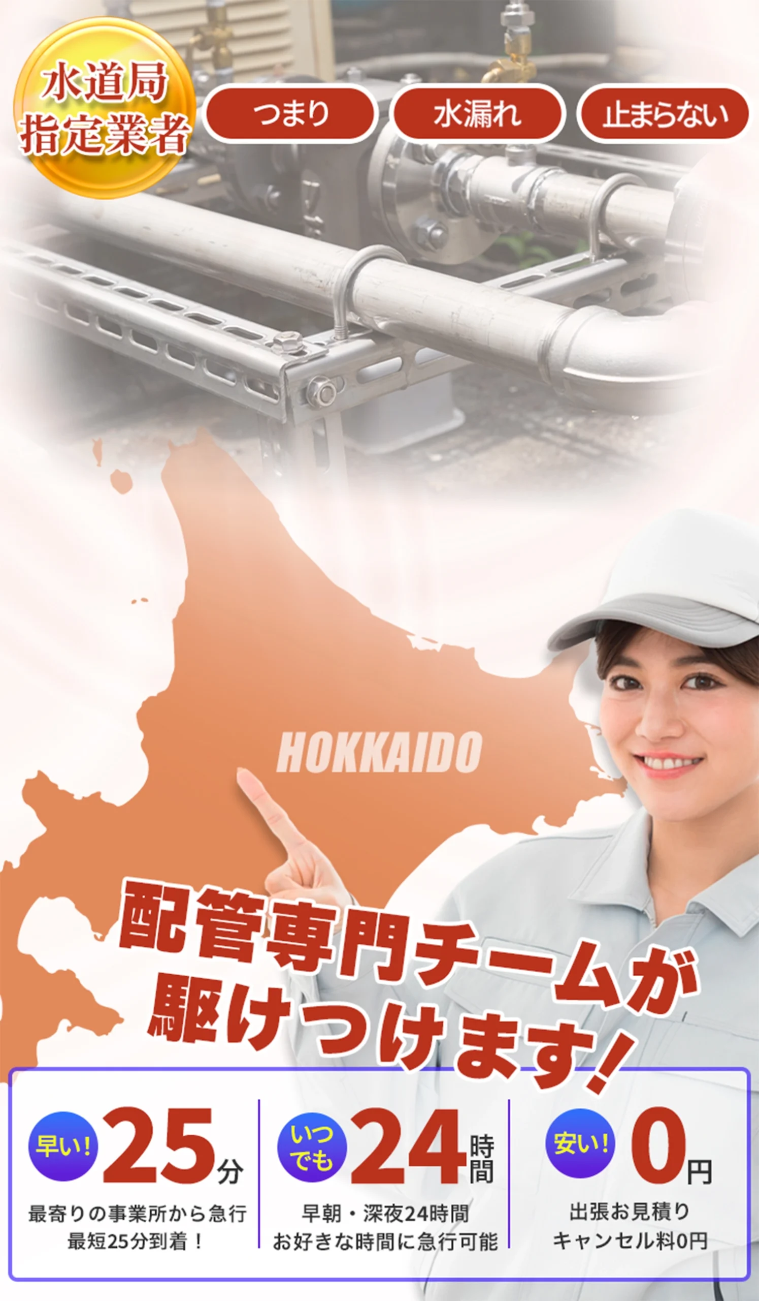 配管専門チームが岩見沢市内出張お見積り・キャンセル料0円で即駆け付けます!
