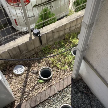 敷地内に樹木などを植えていると、排水桝と排水管の繋ぎ目から根が侵入し、流れを塞ぐようになります。木の根の撤去と管内洗浄を行います。