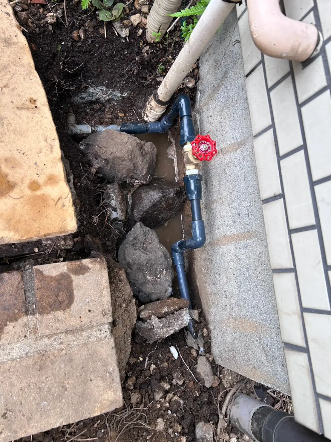 掘削後、劣化した金属バルブを撤去し、耐久性が高い樹脂配管と真鍮バルブで再施工を行いました。交換後は水圧テストを実施し、漏れが完全に止まっていることを確認しております。作業後には周囲の土も整地し、お子さまが触っても問題ない状態に仕上げています。