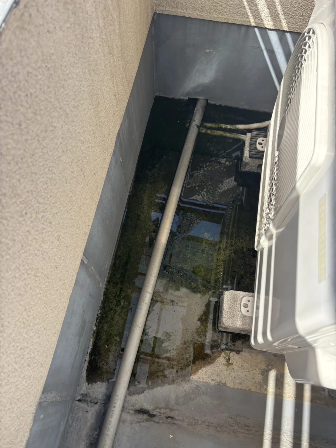 水が溜まり続けていたため、このまま放置すれば漏水や建物への影響も懸念される状況でしたが、高圧洗浄機を使用することで配管内部の汚れ・苔・固着物を一気に除去することができました。