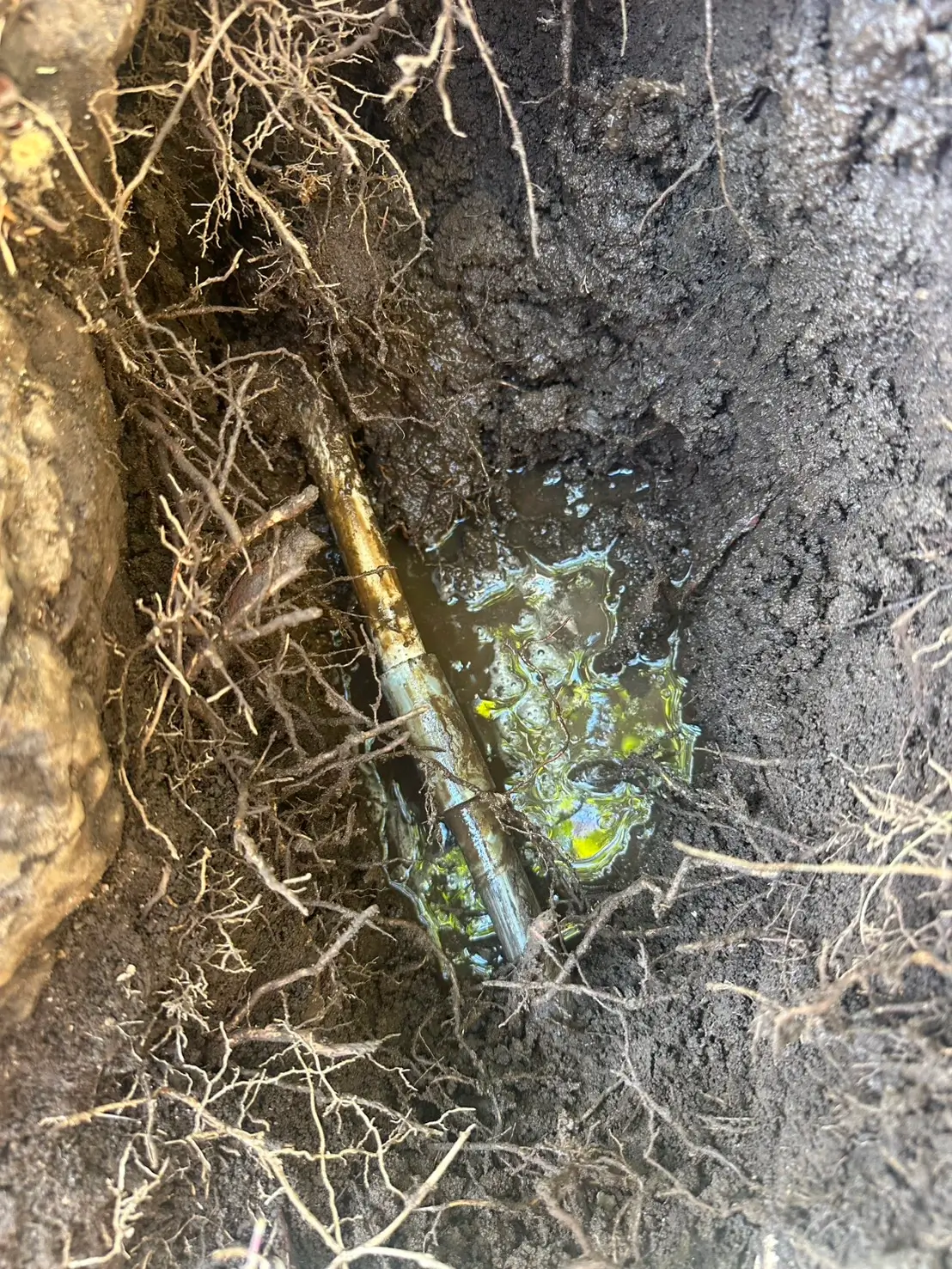 現場にて確認したところ、屋外の給水管が経年劣化と寒暖差の影響により破裂し、漏水が発生しておりました。