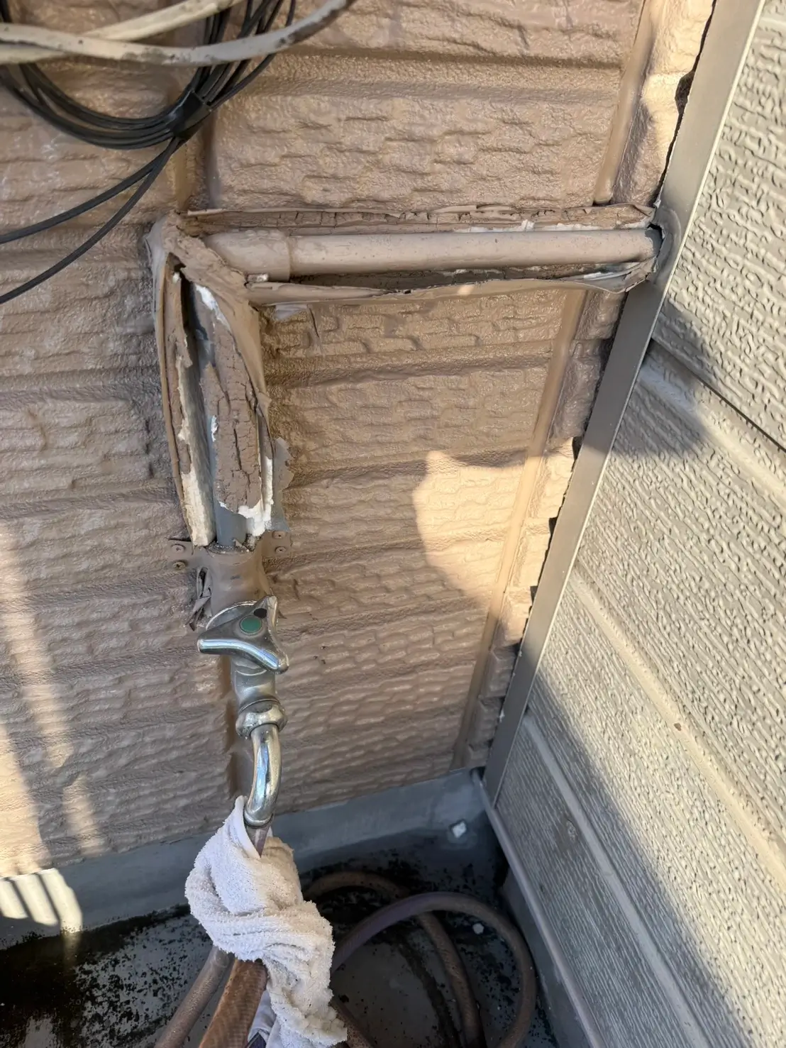 お伺いした際、屋外の給水管が経年劣化および気温変化による影響で破裂し、水が噴き出している状態を確認いたしました。